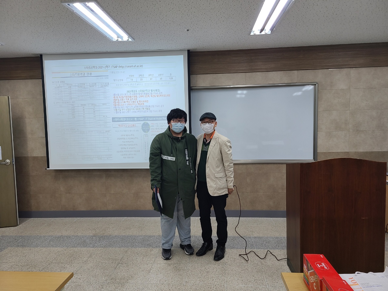 2020-2학기 2차 스마트IT 학생 지원 프로그램(ITSAP : IT Student Assist Program) 운영 ▶ IT 커리어 관리 프로세스 - 4학년:자격증, 이력서, 자소서, 포트폴리오 - 3학년:프로젝트, 공모전준비, SW설계구현 - 2학년:IT동아리, 배움공동체, 해외연수 - 1학년:봉사활동, 격주 자기주도 동아리활동 ▶ 교육과정 개선 활동 및 재학생 관리 - 실시간 소통 강화(학생-교수, 선배-후배, 상담 및 비교과지도) - 상담(학교생활, 출석, 비대면 수업 개선사항, 취업, 휴복학 등) - 1학년 3명, 2학년 5명, 3학년 14명, 교수3명, 조교1명 참여 ▶ 2020 학년별 앨범제작 경진대회 및 스마트IT리그 게임대회 시상식 진행 ▶ 프로그램 진행뒤 즐거운 회식~~~