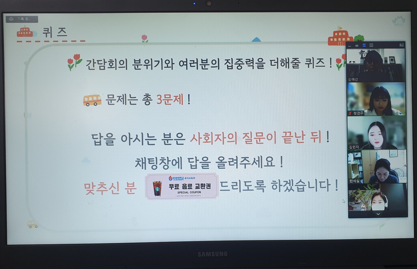 심우 유치원 만 5세반 선생님께서 친구들과 '장수풍뎅이'로 프로젝트 한 활동으로 특강을 해주셨습니다. 이는 기존의 곤충 프로젝트를 더 확장시킨 활동으로_ 이미 장수풍뎅이의 특성과 먹이 등에 사전지식을 갖고 있었던 유아들이, 장수풍뎅이를 채집하기 위해서, 참나무에 장수풍뎅이가 좋아하는 바나나를 바르고, 바나나를 으깬 봉투를 나무에 묶어 놓으며 만나길 기다리는거 부터 시작했다고 해요^^ 장수풍뎅이를 만나러 숲으로 오가는 길에 대근육과 소근육을 활용하여 신나게~ 올라갔을테니 신체운동건강 영역과 통합이 되었고, 장수풍뎅이를 만나러 올라가는 길_ 콧노래도 불렀을 것 같고(음악)~ 장수풍뎅이 집을 만드는 과정(미술)에서 예술경험 영역과 통합이 되었고, 장수풍뎅이를 만나러 올라가는 길에 장수풍뎅이가 바나나를 먹으러 왔을지~ 가서 어떤 말을 건넬지 친구들과 얘기를 나누는 과정에서 의사소통 영역과 통합이 되었으며, 장수풍뎅이의 한 살이 과정을 보면서 자연탐구 영역과도 통합이 되었네요. 또, 프로젝트 끝쯤에 장수풍뎅이를 한 마리씩 집으로 데려가는 과정에서 서로 더 멋진 수컷을 가져가고 싶어했는데, 달님반 선생님께서 교사의 권위를 축소하고 유아들에게 어떻게 했으면 좋을지를 물어 토의하는 과정에서 서로에게 먼저 배려하는 모습을 보였다고도 하는데, 자연스럽게 사회관계 영역과 통합이 되었어요. 선생님 얘기에 의하면, 바나나를 으깬 봉투에 장수풍뎅이가 아닌 말벌이 먼저 나타났었다고 해요. 그럼 자연스럽게 조심해서 보고 위험하게 다가가지 않는 등의 상황을 통해 안전교육도 되었겠네요^^... 이렇듯~ 장수풍뎅이라는 주제 하나만으로도 교사가 어떠한 환경을 제공해 주고, 어떠한 상호작용의 지원을 해주었느냐에 따라 유아들에게 다양한 경험을 제공해 줄 수 있습니다. 여러분들도~ 예비유아교사로서 이후에 교사가 되신다면_ 심우유치원 선생님들처럼 놀이를 통해 유아들 스스로가 능동적인 지식을 구성해 나갈 수 있도록 질 높은 상호작용을 해 줄 수 있는 교사가 되길 바래요^^
